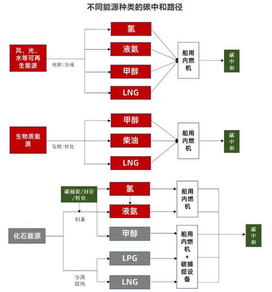 當(dāng)前國(guó)際社會(huì)推進(jìn)氣候治理的核心目標(biāo)是實(shí)現(xiàn)碳中和,而不是消滅化石能源或其它哪一種能源。目前船舶工業(yè)探索的主要船用燃料中,無(wú)論是氫、氨、LNG、LPG還是甲醇,都可以在能源轉(zhuǎn)化或使用過(guò)程中實(shí)現(xiàn)碳中和。