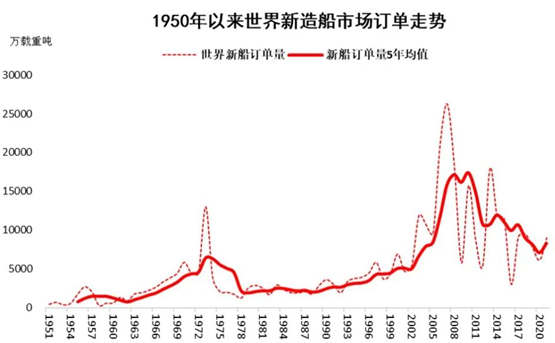 縱觀全球船舶工業(yè)百年發(fā)展史,世界經(jīng)濟(jì)的過(guò)度繁榮或蕭條、國(guó)際海事規(guī)則的巨大變化、大規(guī)模戰(zhàn)爭(zhēng)等因素,將會(huì)拉長(zhǎng)或縮短船舶市場(chǎng)周期。這也是過(guò)去100年船舶市場(chǎng)周期長(zhǎng)短不一、令人迷惑的主要原因。第二次世界大戰(zhàn)對(duì)船舶資產(chǎn)的破壞,導(dǎo)致新造船市場(chǎng)周期不足15年;而IMO于2003年通過(guò)的單殼油輪淘汰公約和中國(guó)經(jīng)濟(jì)高速發(fā)展相疊加,將上輪新造船市場(chǎng)周期拉長(zhǎng)至30多年之久。