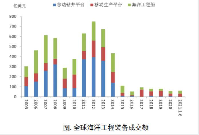 2021年上半年,全球海洋工程裝備新建市場(chǎng)走勢(shì)分化明顯,全球累計(jì)成交各類海工裝備42艘/座、59.6億美元,以金額計(jì)同比上升67.8%。裝備建造訂單總成交金額已超過2020年全年水平,鉆井平臺(tái)與油氣用途海工船建造市場(chǎng)依舊冷淡,移動(dòng)生產(chǎn)平臺(tái)與海上風(fēng)電安裝運(yùn)維裝備成為低迷市場(chǎng)中的主要支撐。生產(chǎn)平臺(tái)訂單共成交12艘/座、31億美元,占上半年全球總成交金額的52%。海上風(fēng)電裝備新建訂單共成交12艘,17.44億美元,占海工船成交額61.2%,占海工裝備總成交額29.3%。